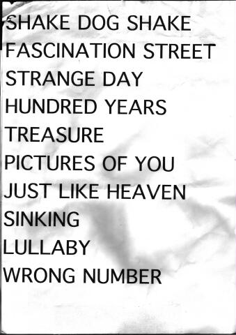 Shake Dog Shake, Fascination Street, Strange Day, 100 Years, Treasure, Pictures Of You, Just Like Heaven, Sinking, Lullaby, Wrong Number, Never Enough, Inbetween Days, From The Edge of the Deep Green Sea, Cut, Disintegration