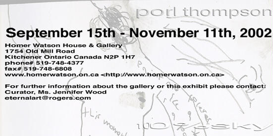 For those of you who are wondering what I'm talking about, Porl Thompson will be having an exhibition of his artwork entitled 100% Sky at the Homer Watson Gallery in Kitchener, Ontario, Canada. The exhibit will run from September 15 - November 10 (opening reception: Sunday, September 15, 2002 from 1 - 4pm). For more information, please visit the Homer Watson website and the Porl Thompson website.