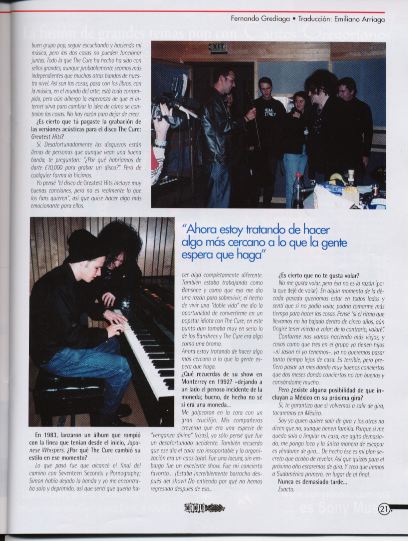Robert: "Current status is: We got about 40 songs and I have to choose which 10 are gonna make the next Cure album. I've got a month [to do that]... it all changed today though, funnily enough, because I thought we were gonna start recording in October, but we got an offer today, this afternoon, to do something in October, which is a really interesting, um, THING! Something unlike we've ever done before. We've just talked about it and I'm very tempted to put recording back a month to do it. Because it's an event that we'd film and that probably would comprise a DVD and we only got one DVD out there. It's something we could do on our own [presumably he means without a record company, since the Cure are not under contract to anybody right now] and it would be a very special one-off event. If we don't do it in October we'll probably do something... the official 25th anniversary of The Cure is next May, I think and Universal are putting together a box set, at last they've agreed to a box set of all the b-sides, rarities and stuff so we may do both [in May]. What I'm hoping to put together for next May is getting all the ex-members of The Cure together on stage and do a big 'history of The Cure night', but it's quite an ambitious project, it might not happen... it'd be good if it did, though!"