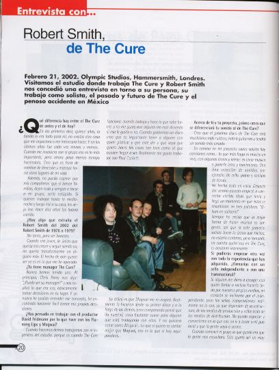 Robert: "Current status is: We got about 40 songs and I have to choose which 10 are gonna make the next Cure album. I've got a month [to do that]... it all changed today though, funnily enough, because I thought we were gonna start recording in October, but we got an offer today, this afternoon, to do something in October, which is a really interesting, um, THING! Something unlike we've ever done before. We've just talked about it and I'm very tempted to put recording back a month to do it. Because it's an event that we'd film and that probably would comprise a DVD and we only got one DVD out there. It's something we could do on our own [presumably he means without a record company, since the Cure are not under contract to anybody right now] and it would be a very special one-off event. If we don't do it in October we'll probably do something... the official 25th anniversary of The Cure is next May, I think and Universal are putting together a box set, at last they've agreed to a box set of all the b-sides, rarities and stuff so we may do both [in May]. What I'm hoping to put together for next May is getting all the ex-members of The Cure together on stage and do a big 'history of The Cure night', but it's quite an ambitious project, it might not happen... it'd be good if it did, though!"